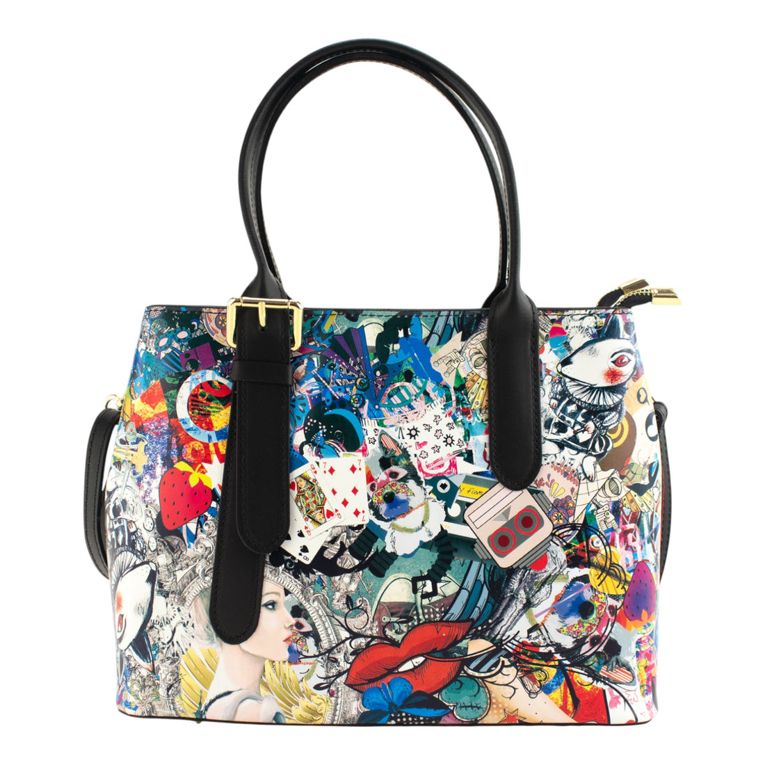 Bolso en piel Pregato Eleganza Negro Flores azules