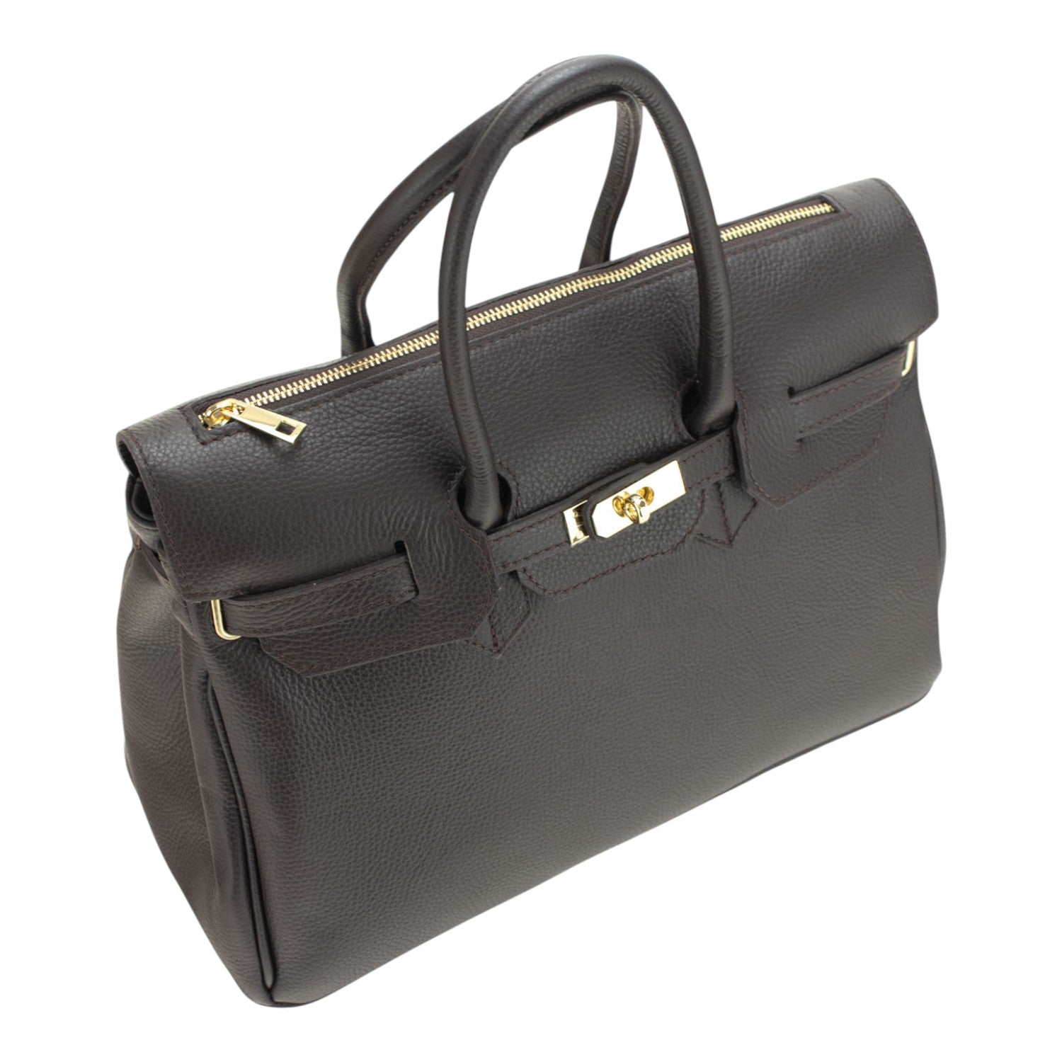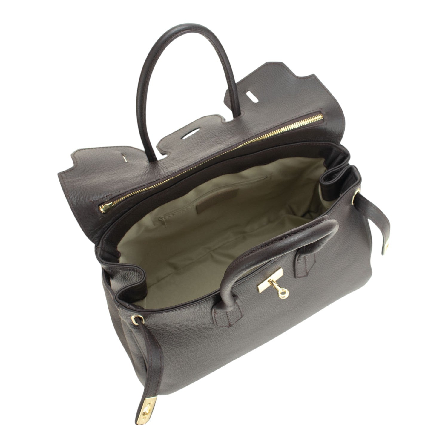 Un bolso muy original para lucir a diario, realizado en Piel 100% genuina vacuno italiana, este bolso está hecho en Italia con una excelente manufactura y calidad, tiene un compartimento interior amplio y cierre de broche además de un cierre superior con cremallera para facilitar el acceso al compartimento principal. Dispone de cómodas asas para llevar de mano.