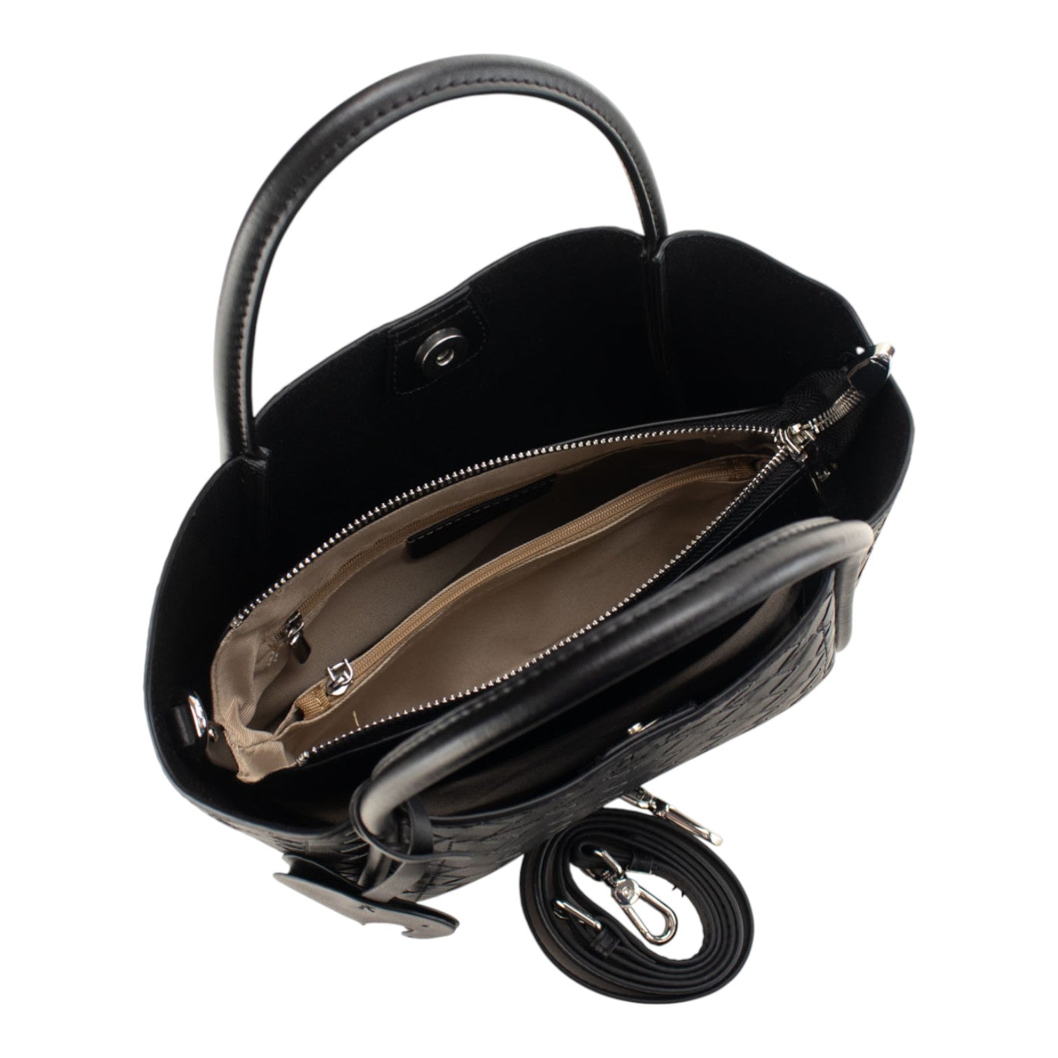 Confeccionado en piel de vacuno 100%, este bolso destaca por su estructura equilibrada y su tamaño perfecto para el día a día. Incorpora doble asa de mano para llevarlo cómodamente y una cinta de bandolera adicional ajustable que permite llevarlo también cruzado o al hombro según la ocasión.