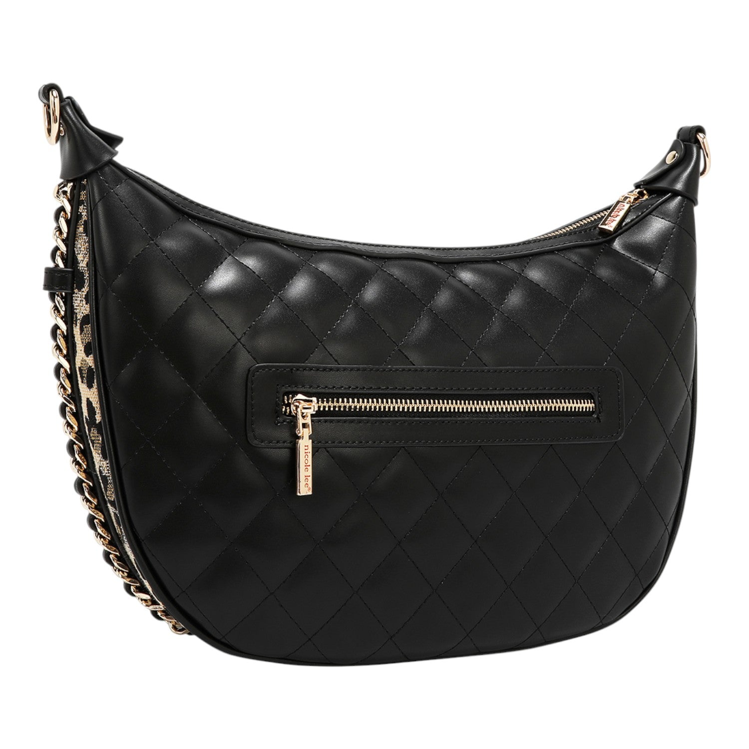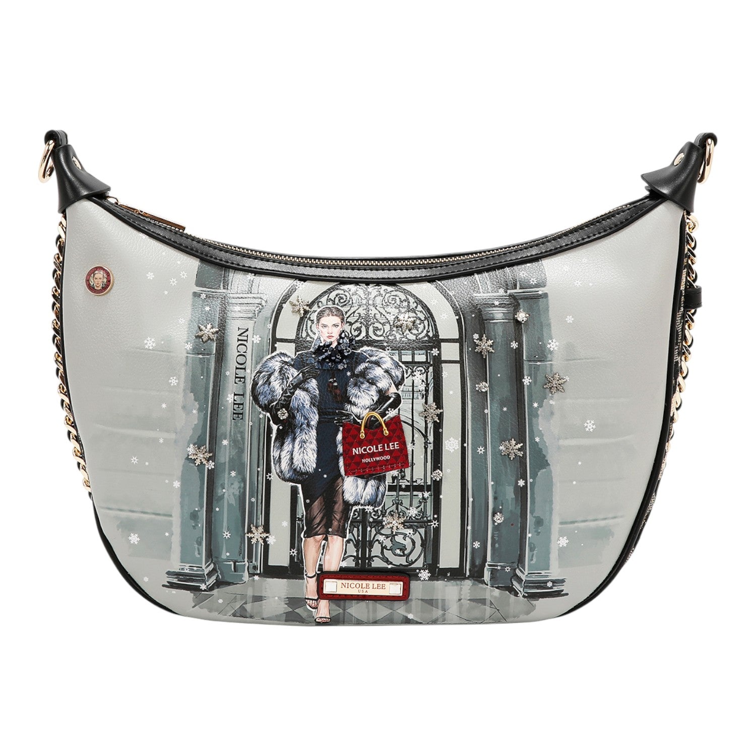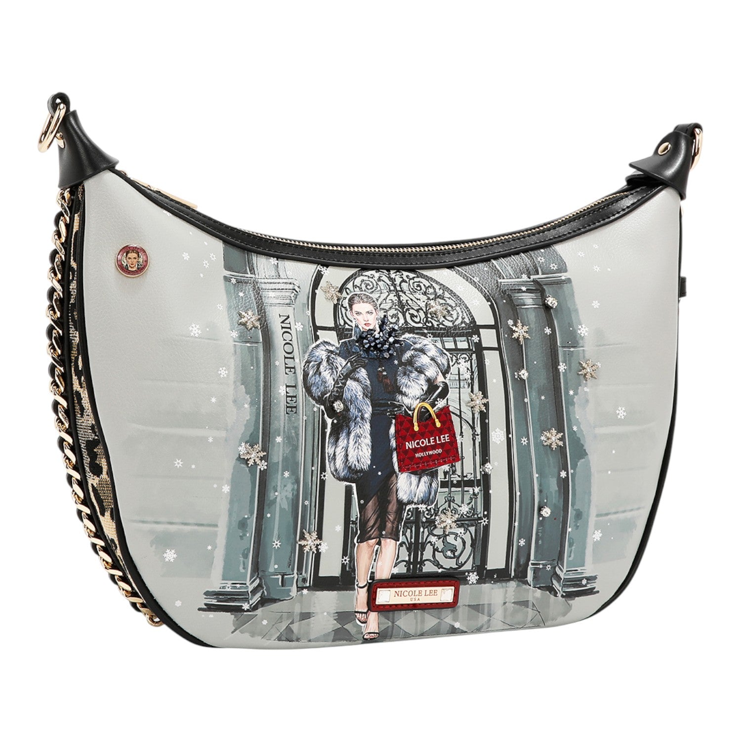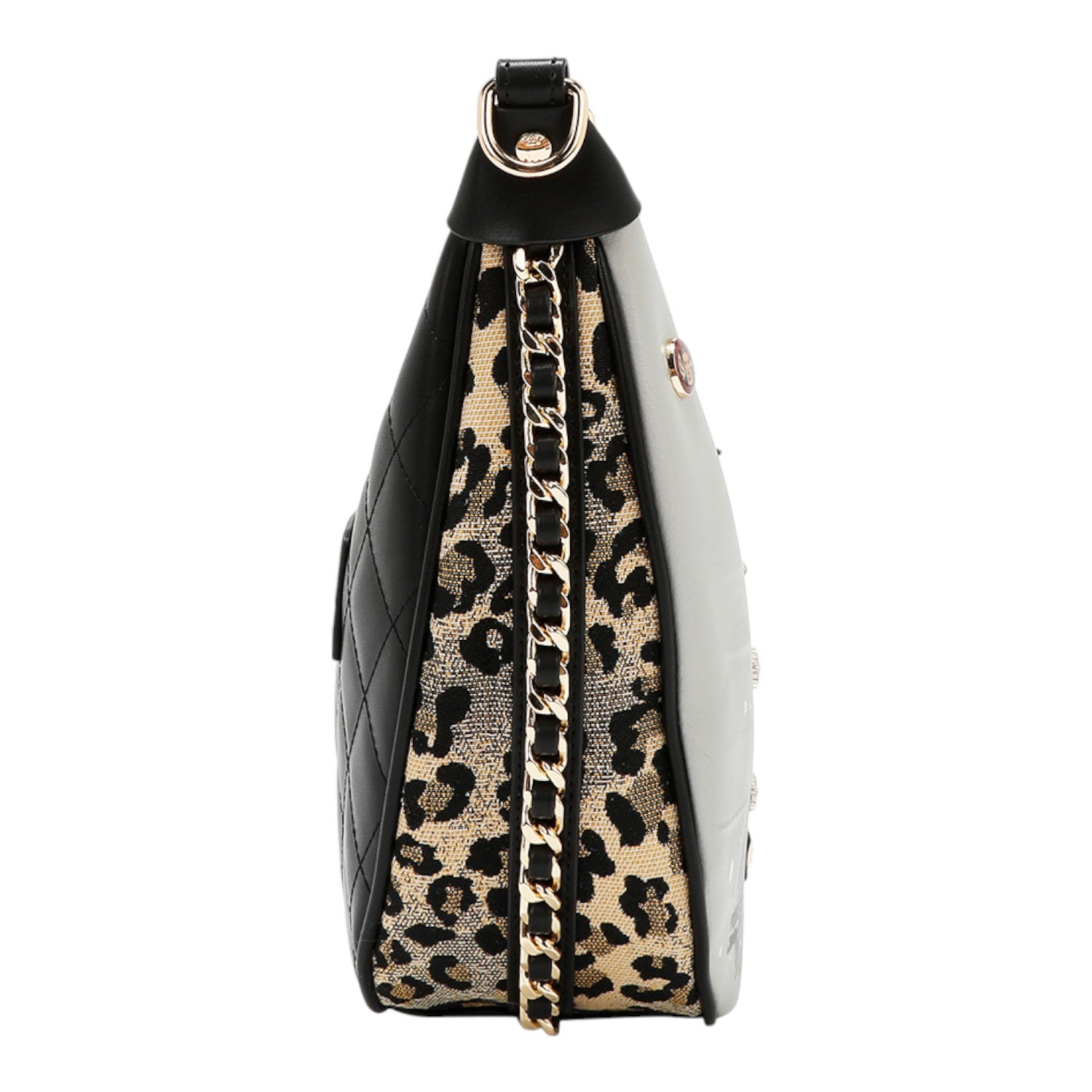 Bolso bandolera Nicole Lee de la nueva colección Moda SnowFlake con cinta regulable a la altura deseada, cierre de cremallera completo, lateral con decoración de cadena, estampado de leopardo, pedrería en la parte frontal y apliques para un efecto 3 dimensiones.