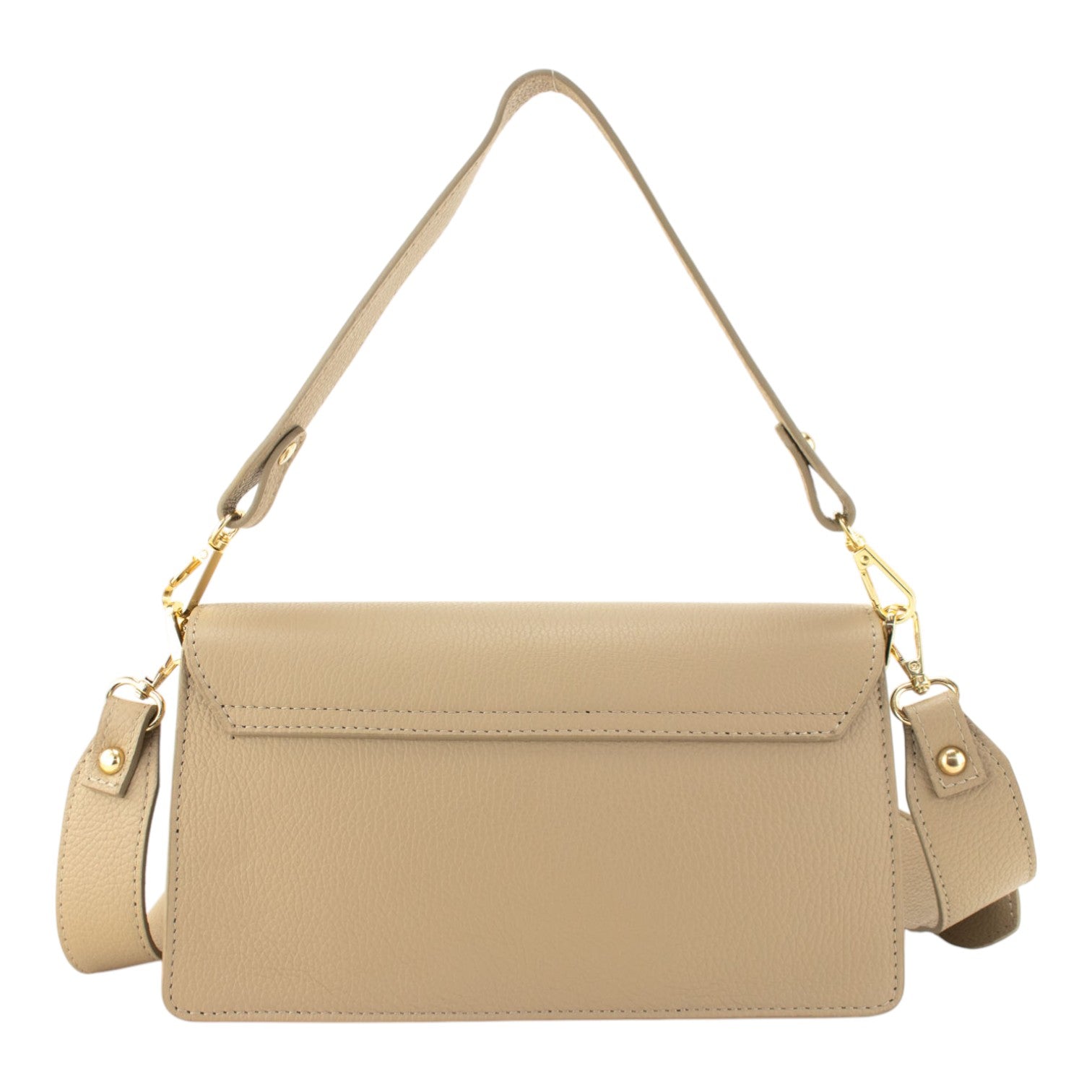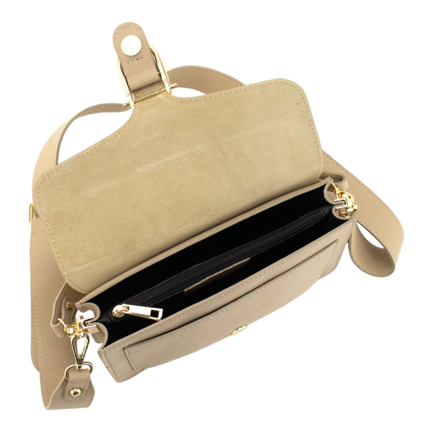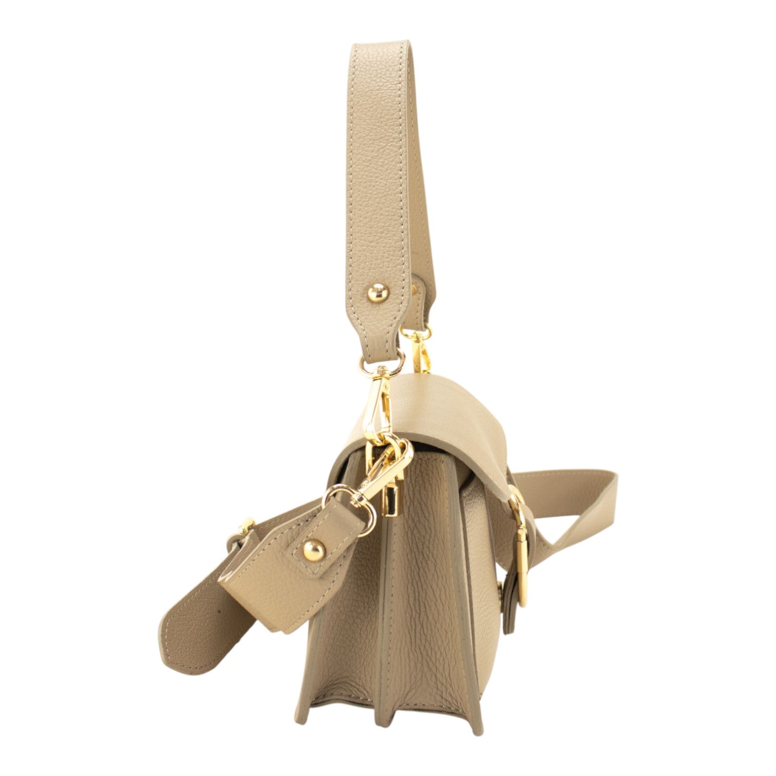 Una bandolera muy original para lucir a diario, realizada en Piel 100% genuina vacuno italiana, esta bandolera está hecha en Italia con una excelente manufactura y calidad, tiene un cierre broche metalizado en tono dorado muy original, con cierre de cremallera interior, con una preciosa cinta de bandolera ajustable para llevar cruzado o al hombro.