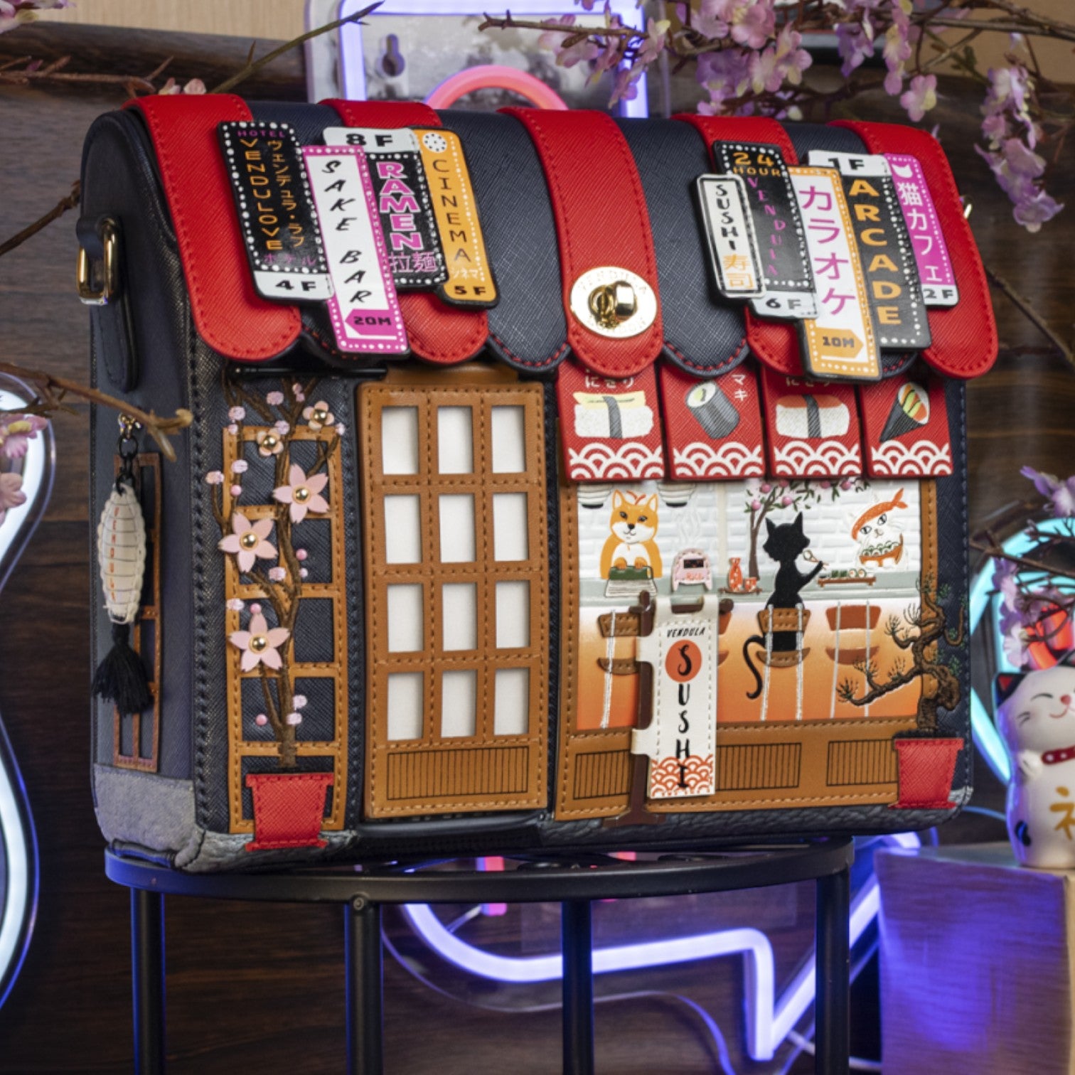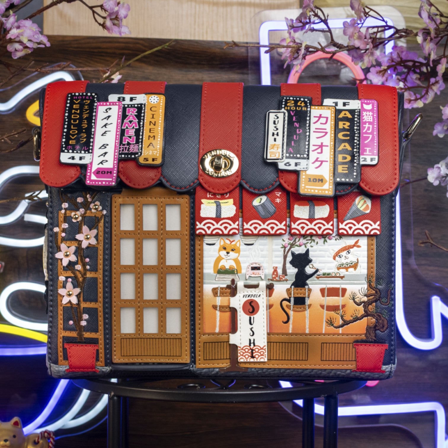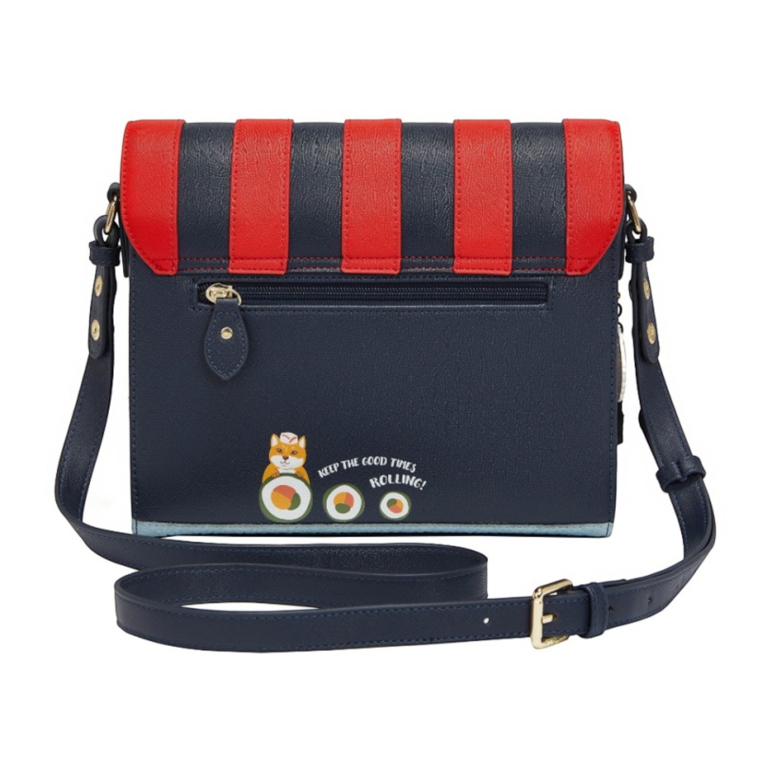 Este bolso es ideal para los amantes de la cultura japonesa, confeccionado en cuero vegano y de tamaño medio con cierre de solapa y cremallera, con cinta ajustable regulable. Tiene un compartimento amplio. Está repleto de detalles combinando tonos azules oscuros y naranjas ¡Precioso!