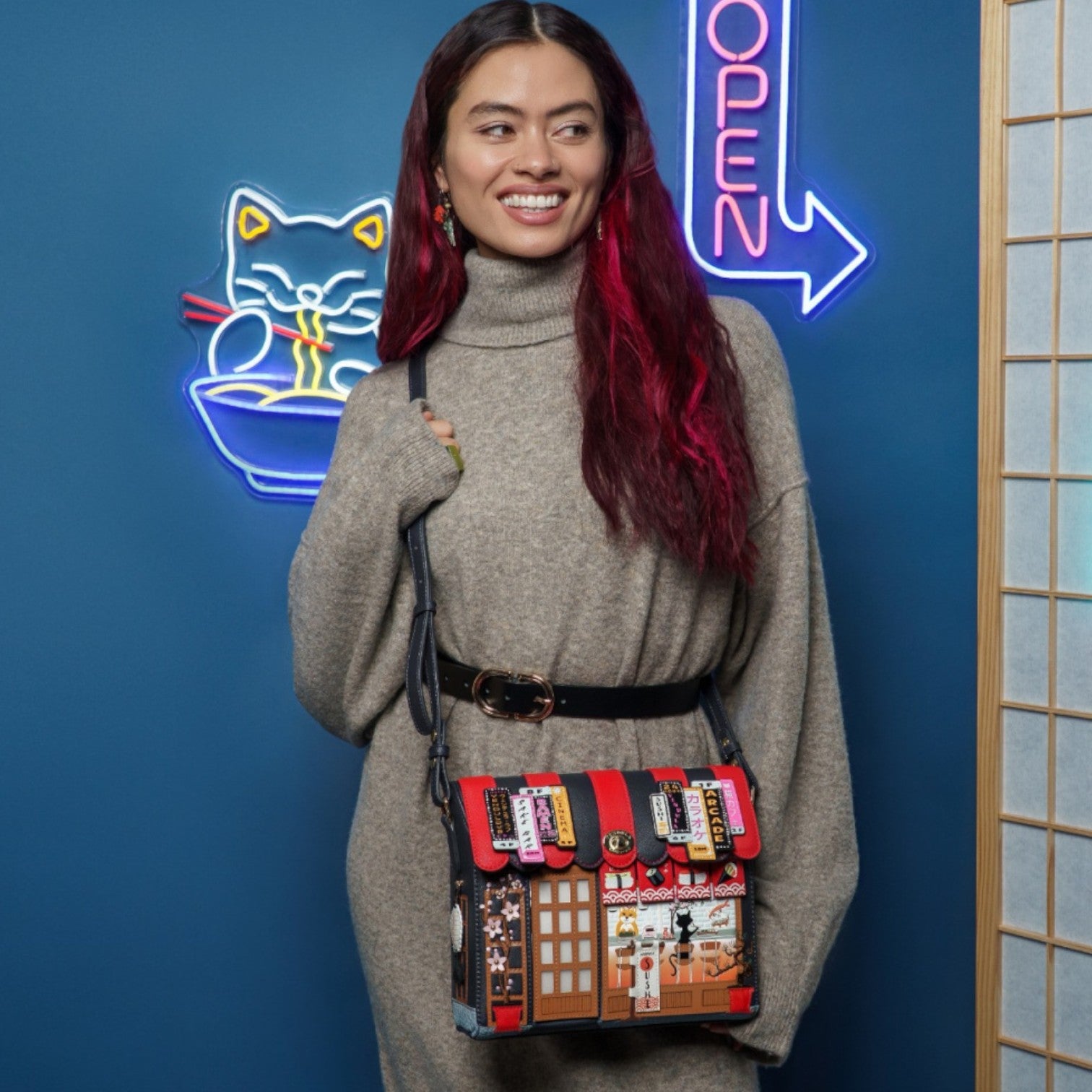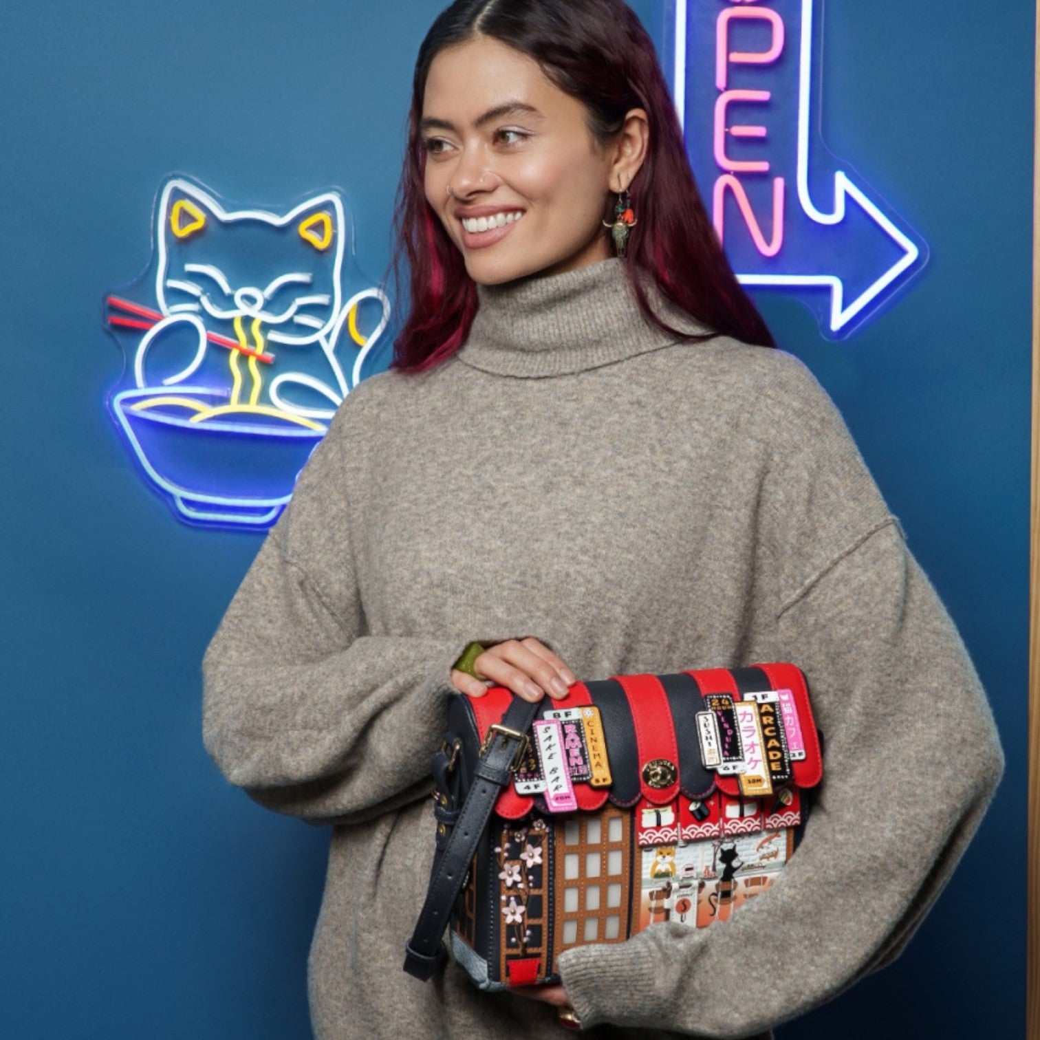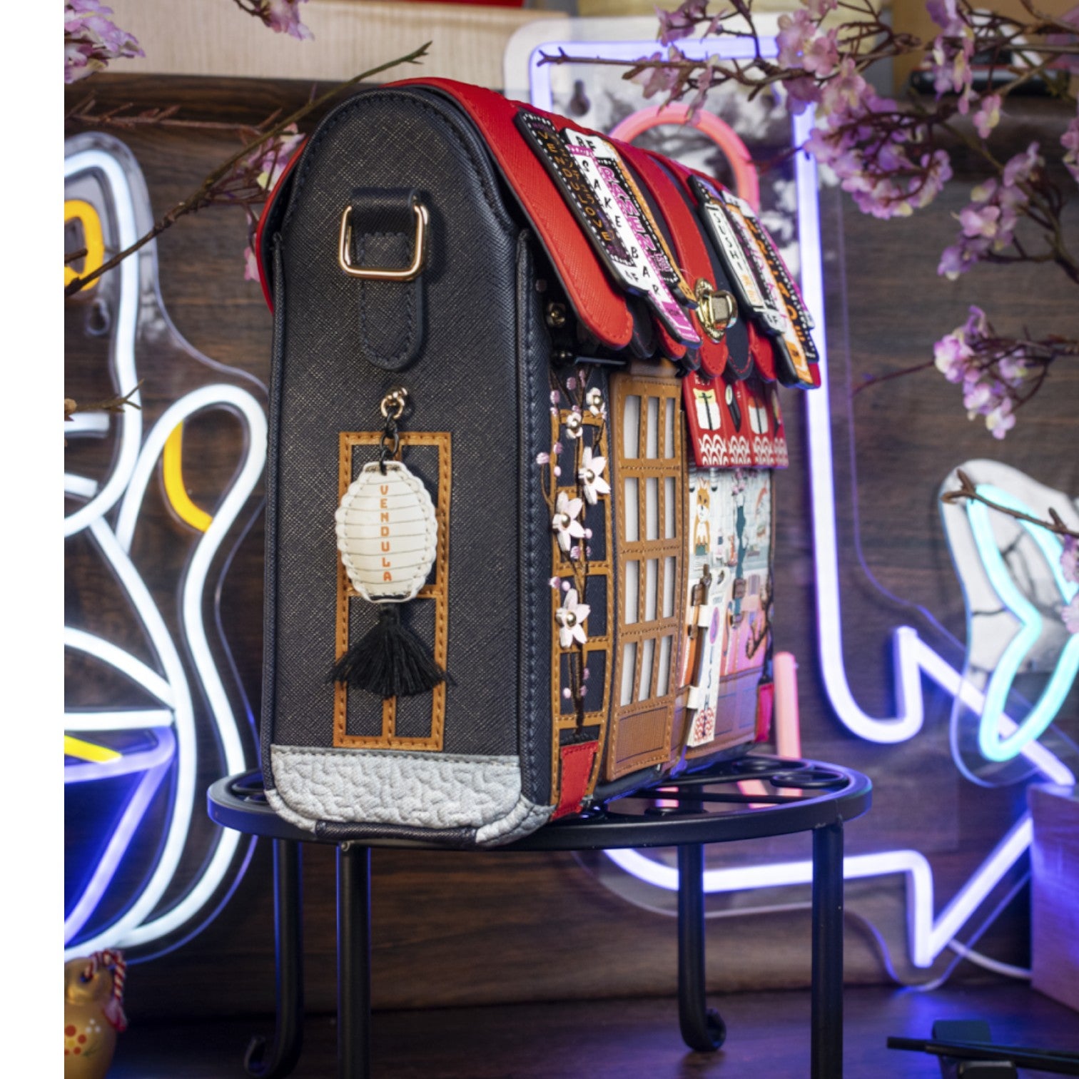 Este bolso es ideal para los amantes de la cultura japonesa, confeccionado en cuero vegano y de tamaño medio con cierre de solapa y cremallera, con cinta ajustable regulable. Tiene un compartimento amplio. Está repleto de detalles combinando tonos azules oscuros y naranjas ¡Precioso!