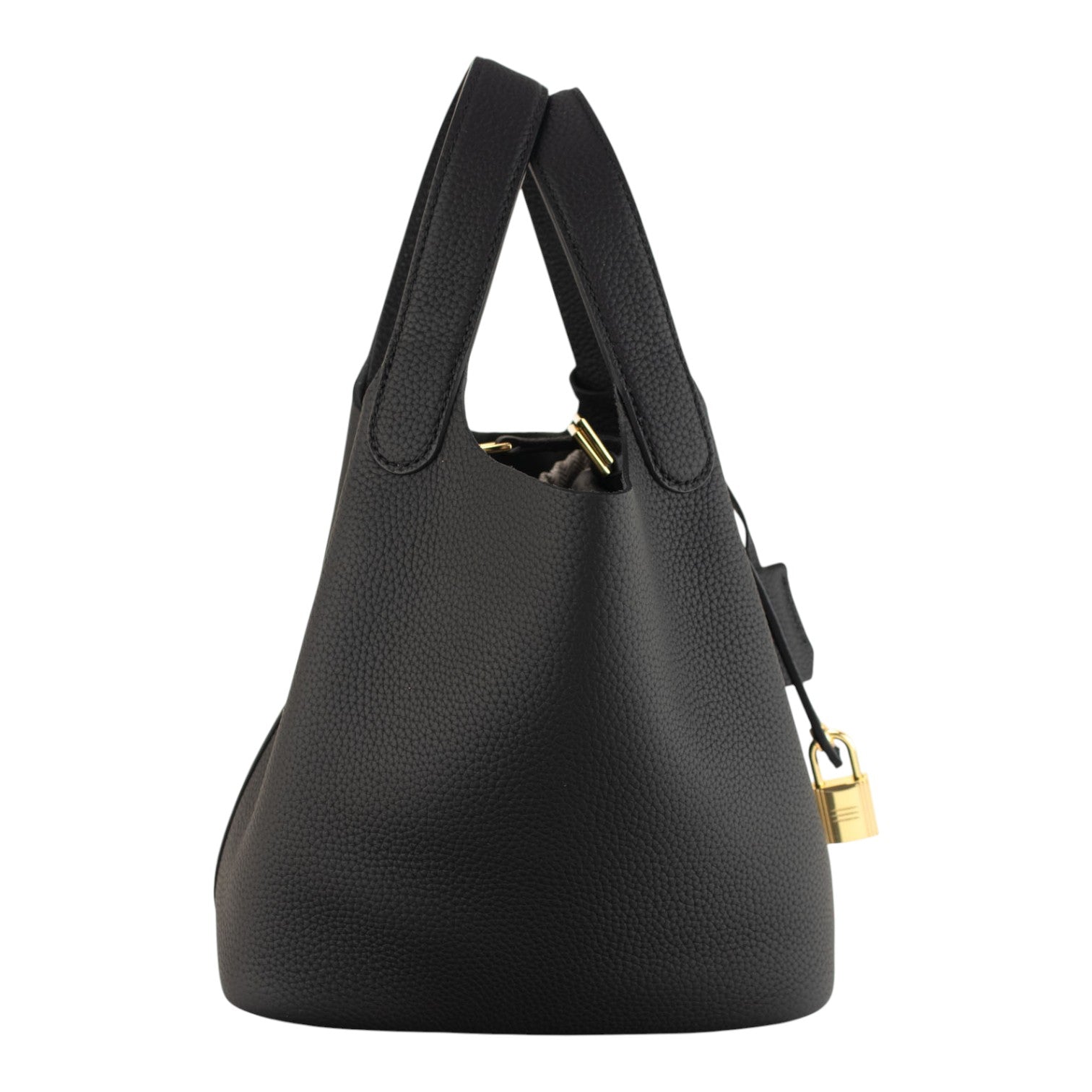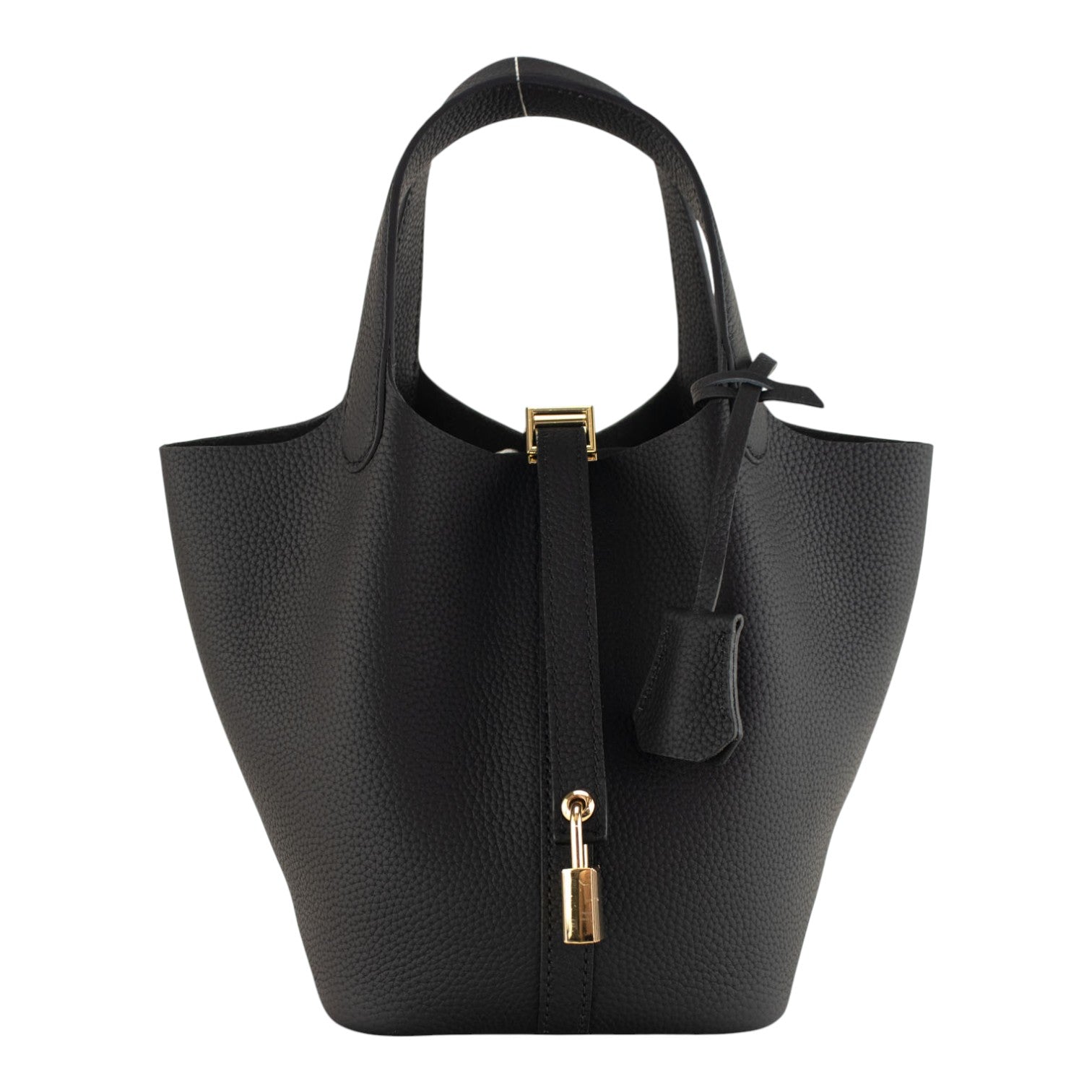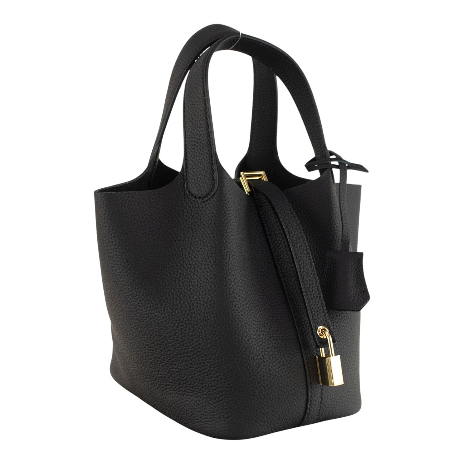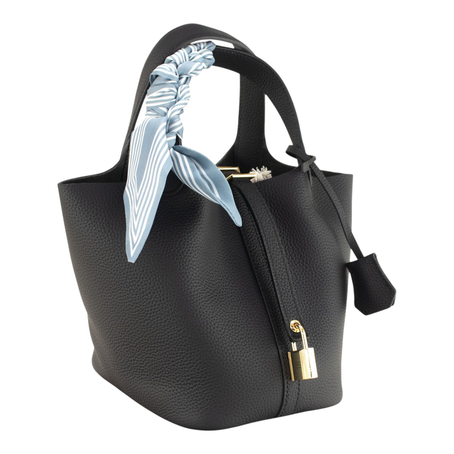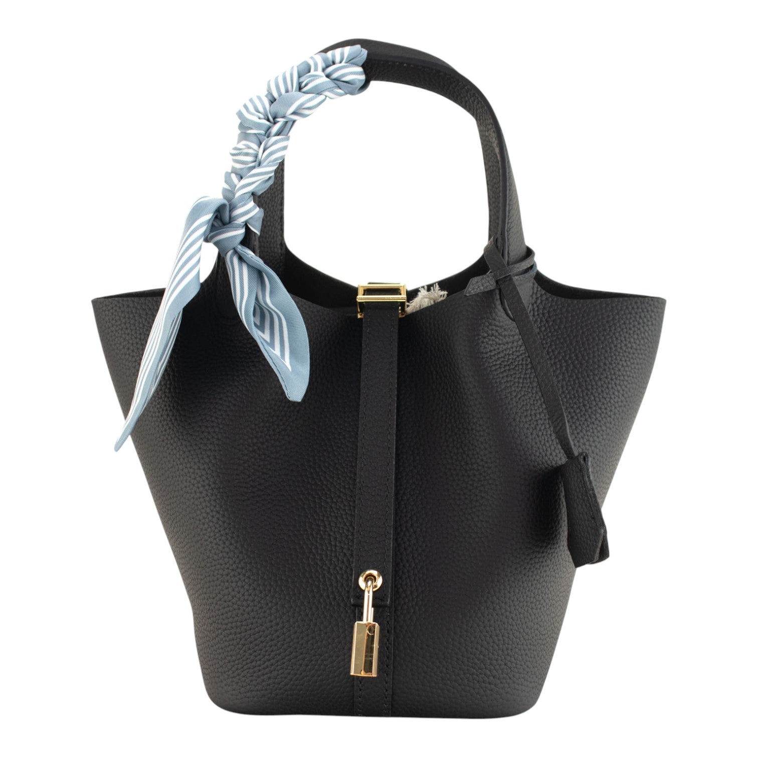Su tamaño pequeño pero espacioso es ideal para el día a día, permitiéndote llevar lo esencial de forma organizada y cómoda. Tiene doble asa de mano y un original cierre con tira y candado. Pañuelo de la imagen incluido