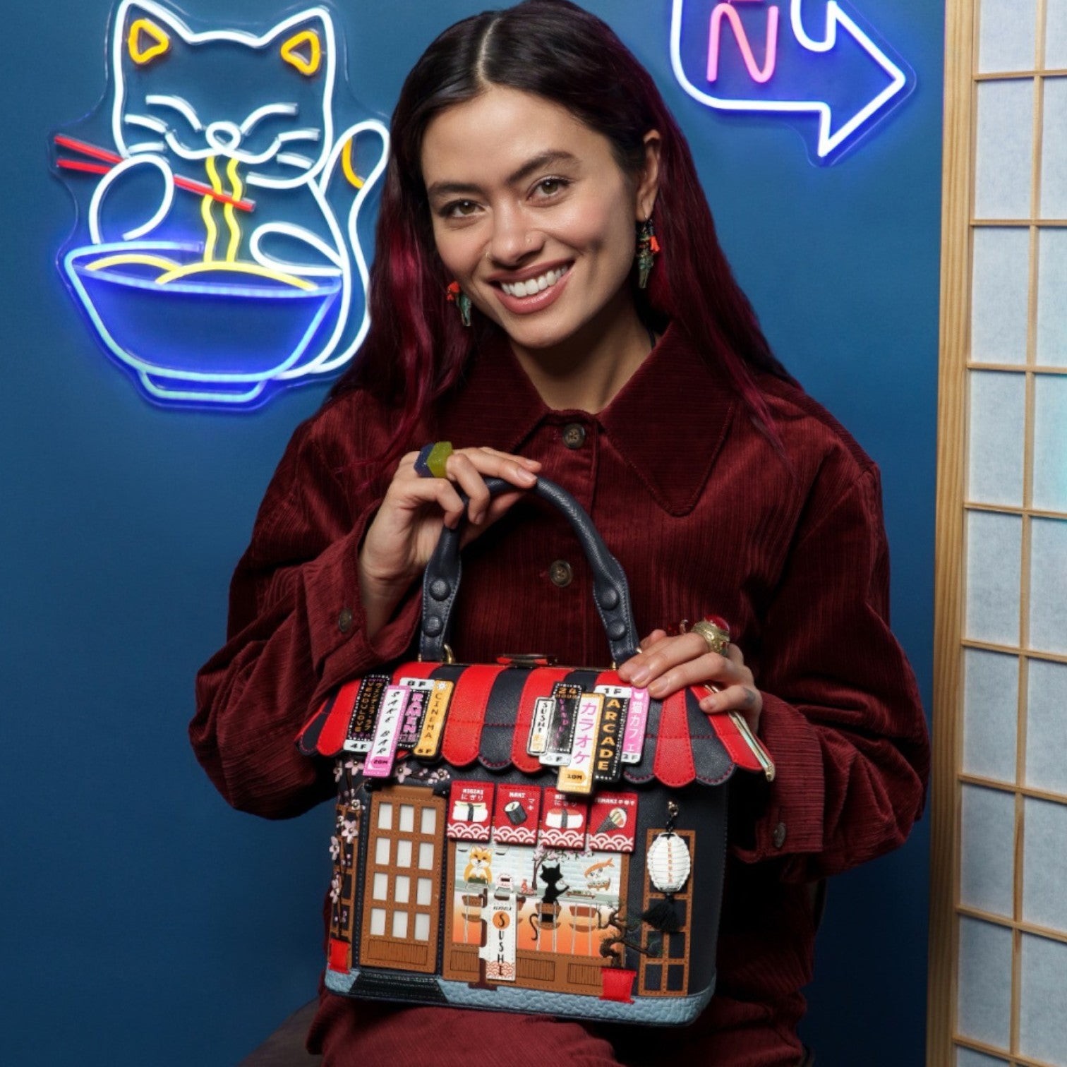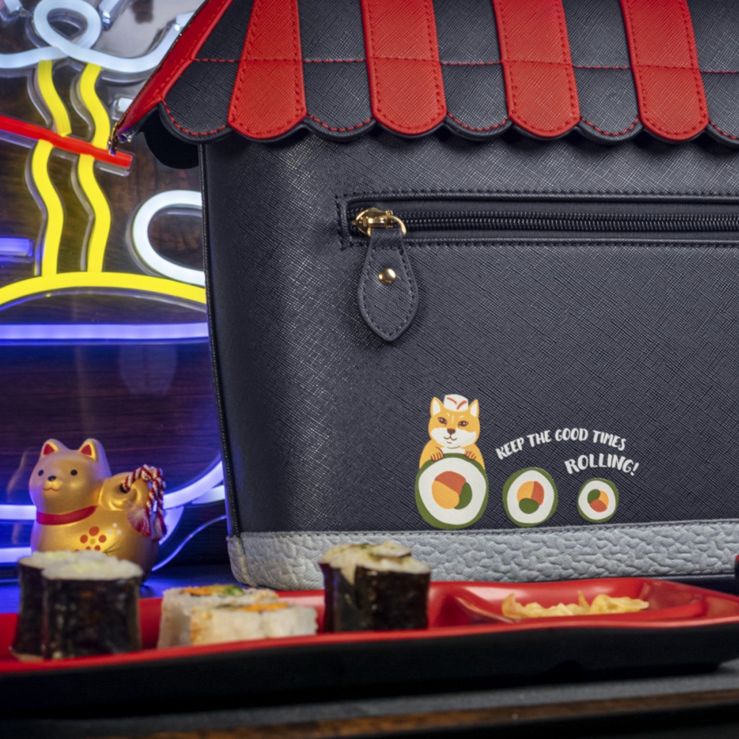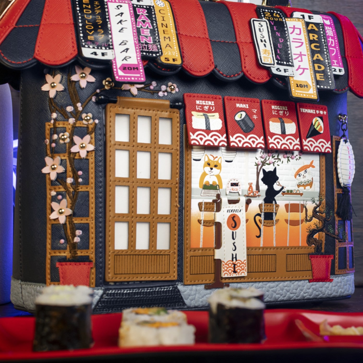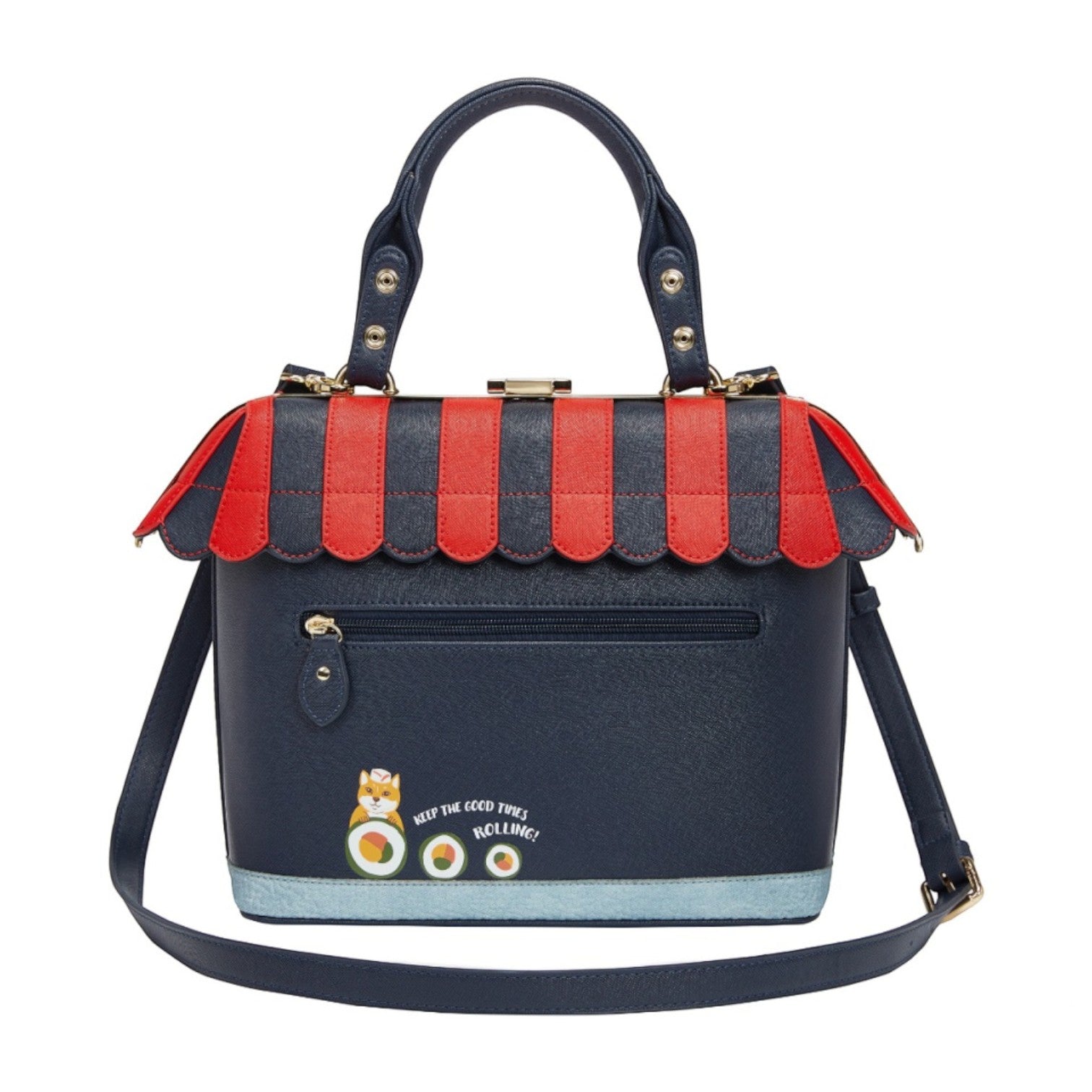 Un bolso que te enamorará nada más tenerlo, está repleto de detalles combinando tonos azul oscuro y naranja, es el bolso perfecto para los amantes de la cultura japonesa, viene con detalles en relieve y bordados que lo hacen único, tiene apertura con cierre semi rígido con broche y cremallera, además de cinta regulable.