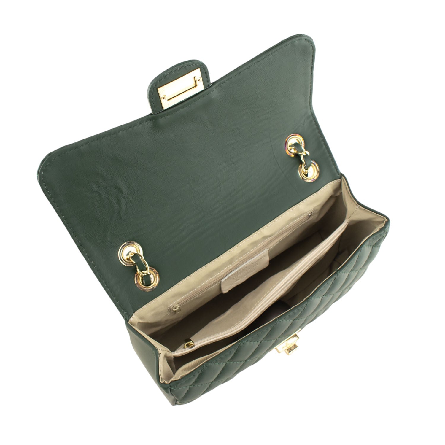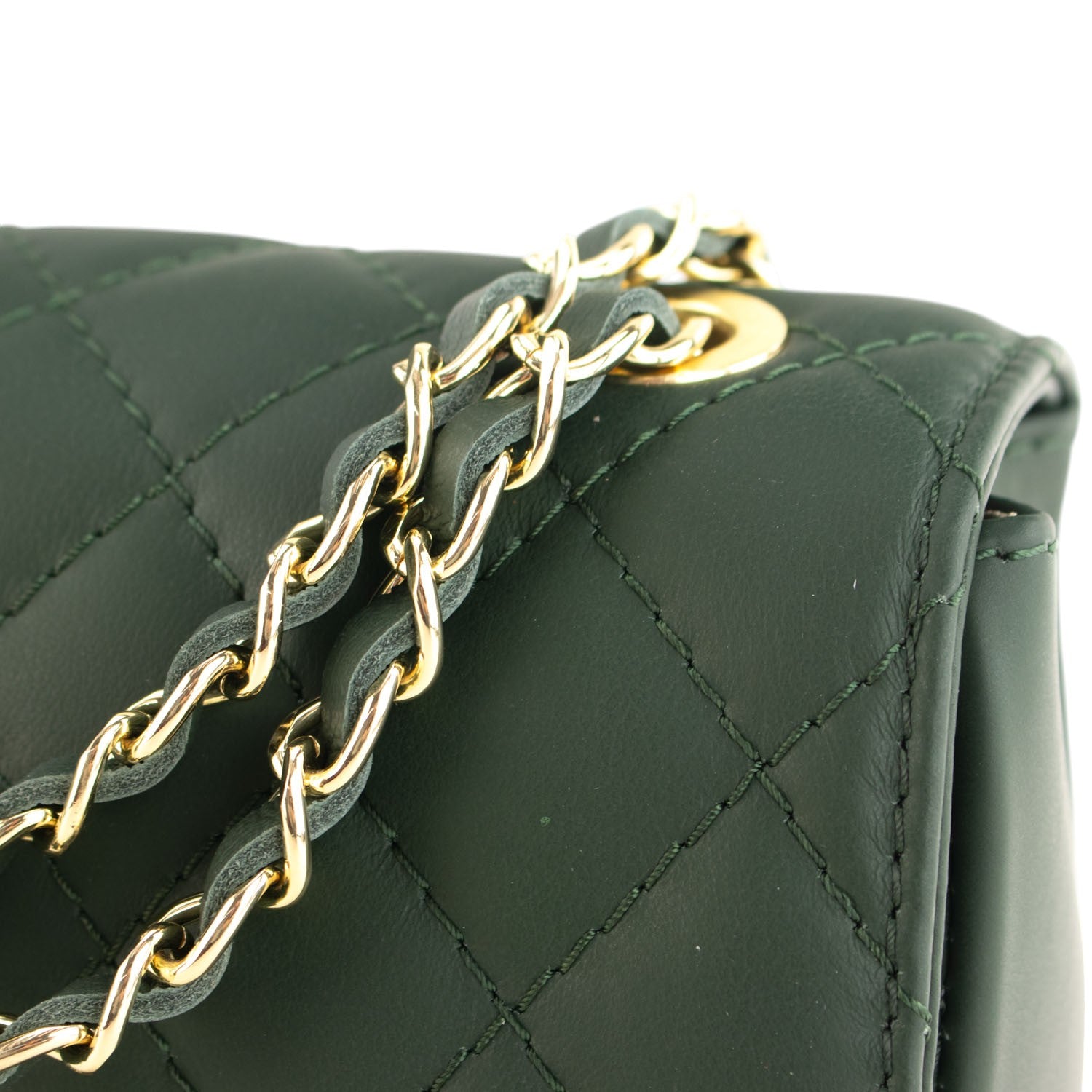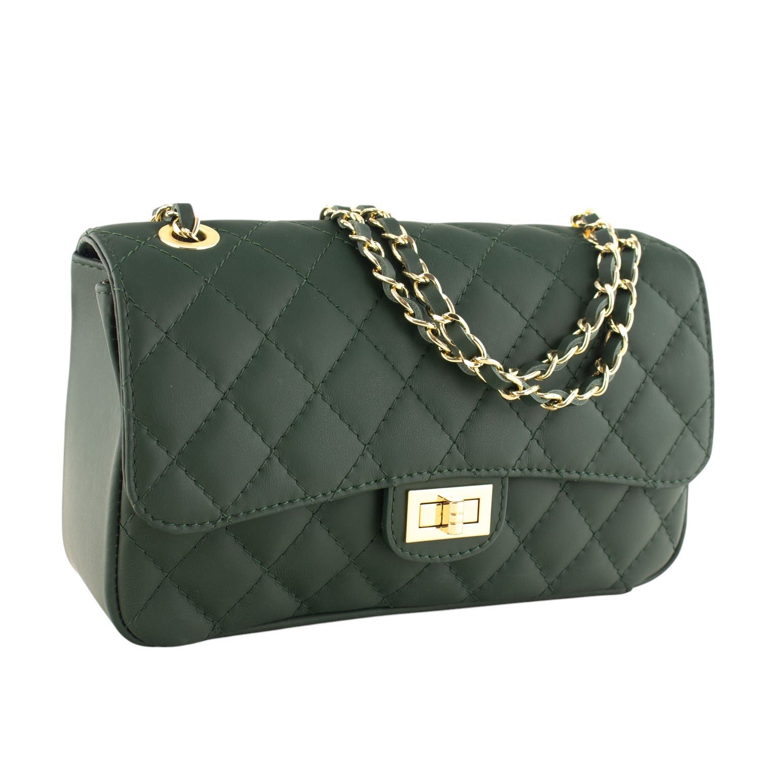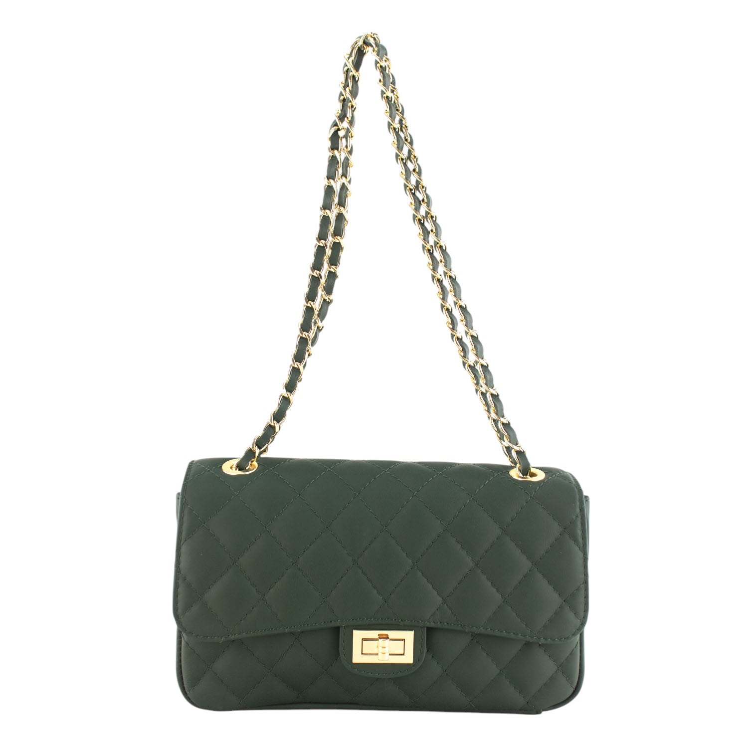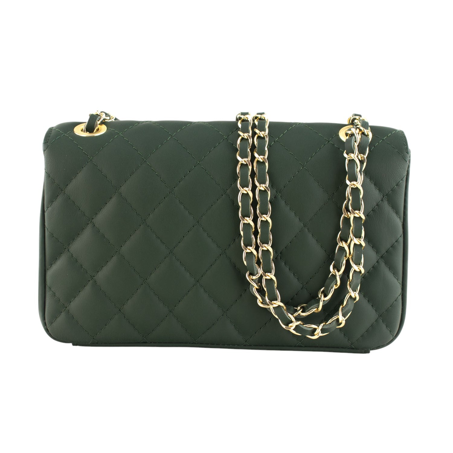 Un bolso super original para lucir a diario, realizado en Piel 100% genuina vacuno italiana, este bolso está hecho en Italia con una excelente manufactura y calidad, tiene un cierre broche metalizado en tono dorado muy original, con una preciosa cinta de cadena en tonos dorados para llevar cruzado o al hombro.